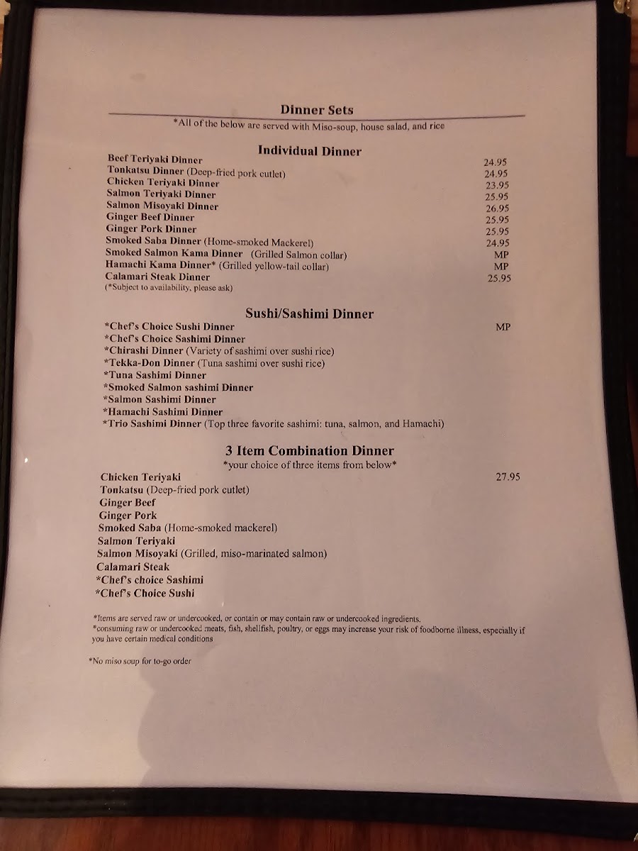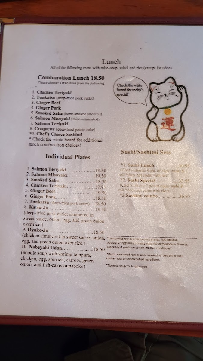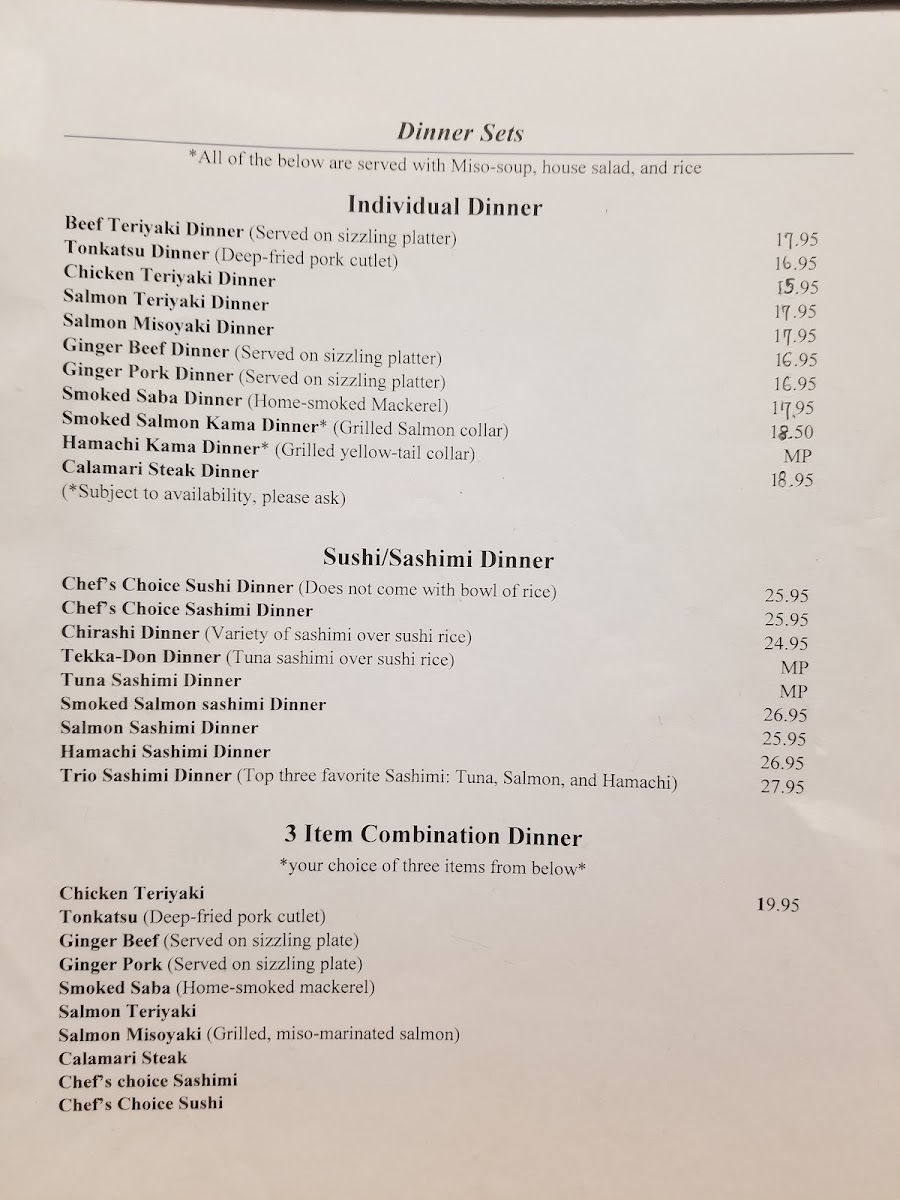 - Combination Menu: Choose from delectable options like chicken teriyaki, tonkatsu, and salmon misoyaki, starting at $18.50.